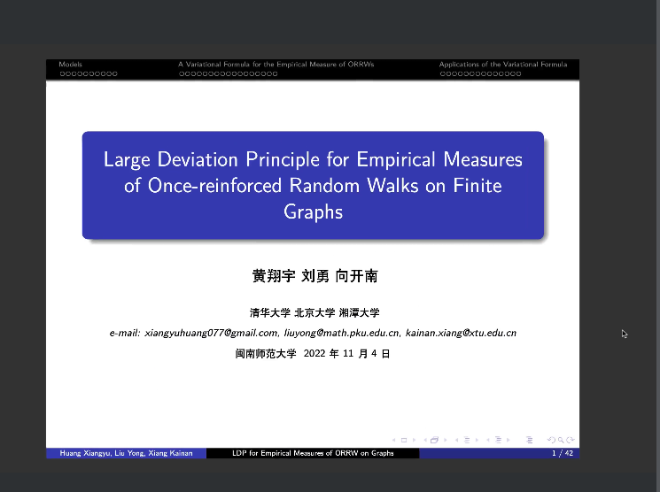 邀请,11月4日下午,北京大学刘勇教授在腾讯会议作了题为《有限图上随机游走的经验大偏差原则》的报告。相关师生聆听了此次报告,报告由施建华老师主持。