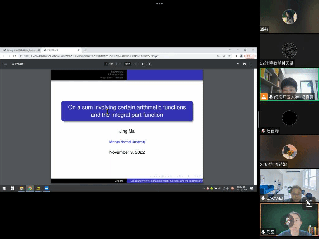 邀请,11月9日下午,吉林大学马晶教授在腾讯会议作了题为《On a sum involving arithmetic function and the integral part function》的报告。相关师生聆听了此次报告,报告由冯真真老师主持。