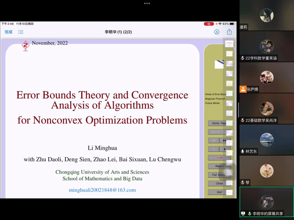 邀请,11月10日下午,重庆文理学院李明华副教授在腾讯会议作了题为《非凸函数的误差界理论及在下降算法收敛率中的应用》的报告。相关师生聆听了此次报告,报告由林艺东老师主持。