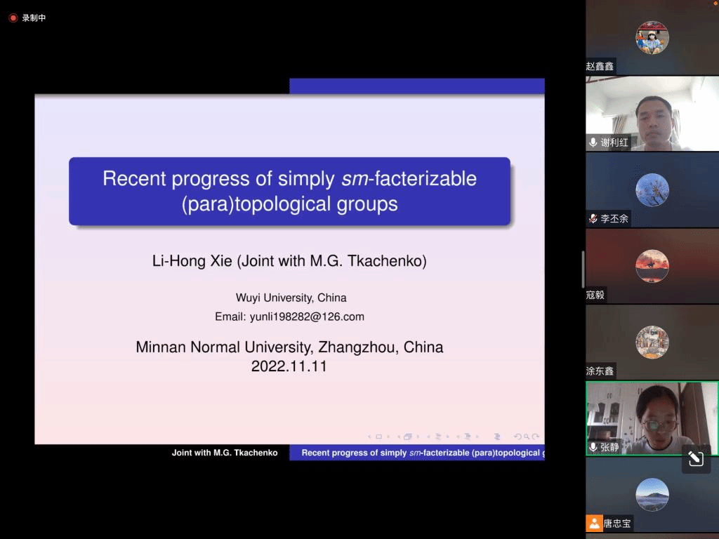 邀请,11月11日下午,五邑大学谢利红副教授在腾讯会议作了题为《Recent progress of simply sm-factorizble (para)topological groups》的报告。相关师生聆听了此次报告,报告由唐忠宝老师主持。
