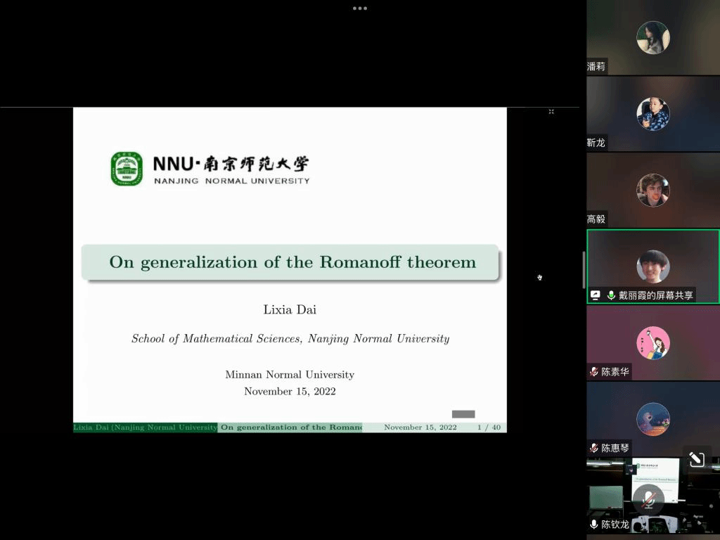 邀请,11月15日下午,南京师范大学戴丽霞教授在腾讯会议作了题为《On generalization of the Romanoff theorem》的报告。相关师生聆听了此次报告,报告由曹炜老师主持。