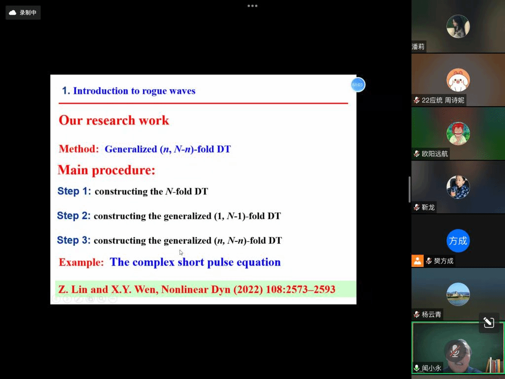 邀请,11月16日晚上,北京信息科技大学闻小永教授在腾讯会议作了题为《Position controllable loop localized wave solutions》的报告。相关师生聆听了此次报告,报告由樊方成老师主持。