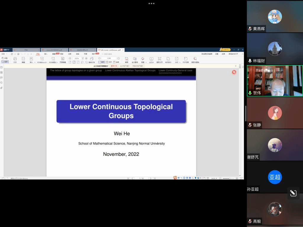 邀请,11月19日上午,南京师范大学贺伟教授在腾讯会议作了题为《Lower Continuous Topological Groups》的报告。相关师生聆听了此次报告,报告由林福财老师主持。