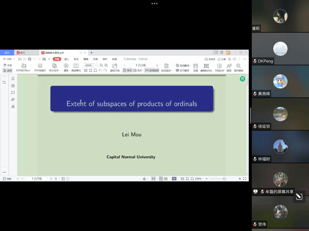 邀请,11月19日上午,首都师范大学牟磊教授在腾讯会议作了题为《序数乘积的子空间的extent》的报告。相关师生聆听了此次报告,报告由林福财老师主持。