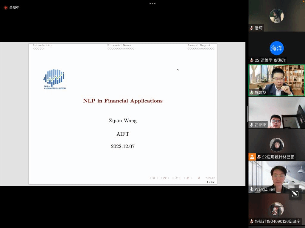 邀请,12月7日下午,香港人工智能金融科技实验室研究员王子剑在腾讯会议作了题为《自然语言处理在金融中的应用》的报告。相关师生聆听了此次报告,报告由施建华和吕阳阳老师主持。