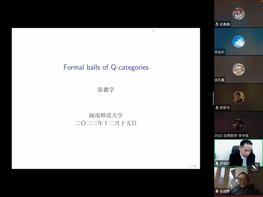邀请,12月15日下午,四川大学张德学教授在腾讯会议作了题为《Formal balls of Q-categories》的报告。相关师生聆听了此次报告,报告由唐忠宝老师主持。