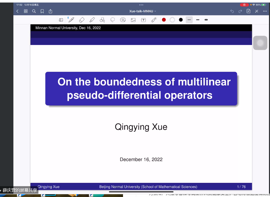 邀请,12月16日下午,北京师范大学薛庆营教授在腾讯会议作了题为《On the boundedness of multilinear pseudo-differential operators》的报告。相关师生聆听了此次报告,报告由温泳铭老师主持。