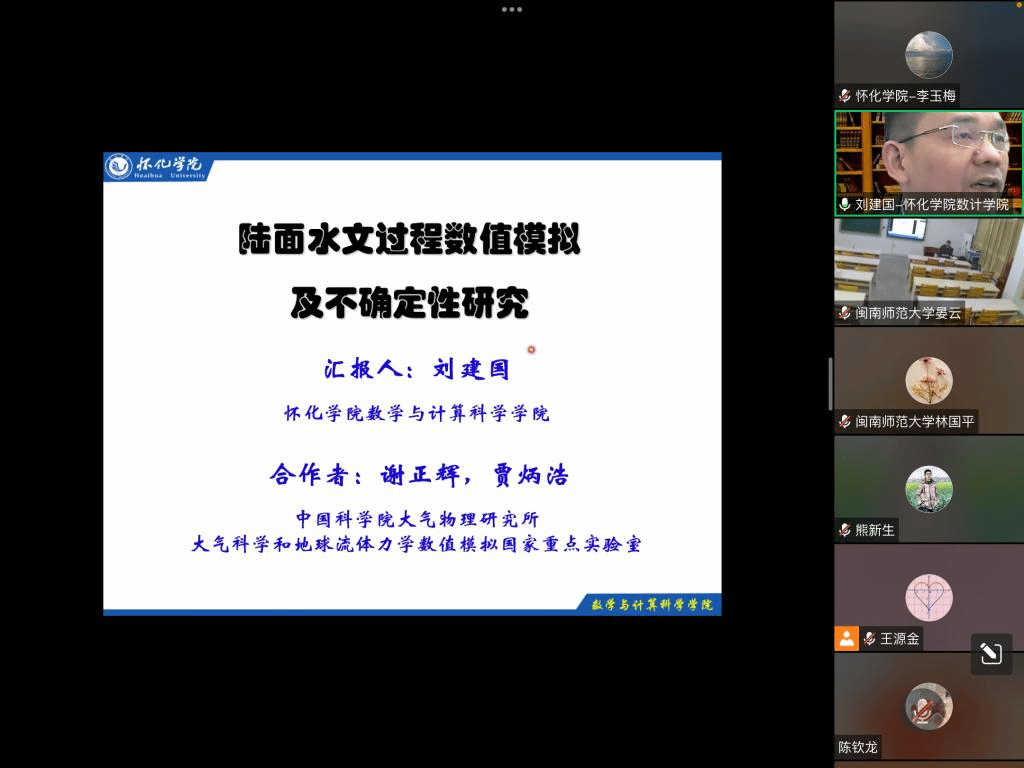 邀请,5月14日晚上,怀化学院刘建国教授在腾讯会议作了题为《陆面水文过程数值模拟与不确定性研究》的报告。相关师生聆听了此次报告,报告由晏云老师主持。