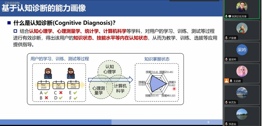 邀请,9月11日下午,中国科学技术大学刘淇教授在腾讯会议作了题为《伴随式认知诊断:方法与应用》的报告。相关师生聆听了此次报告,报告由林艺东老师主持。