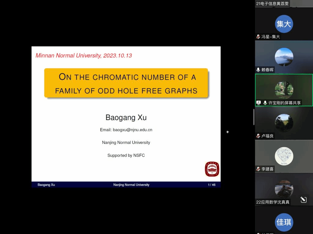 邀请,10月14日下午,南京师范大学许宝刚教授在腾讯会议作了题为《On the chromatic number of a family of odd hole free graphs》的报告。相关师生聆听了此次报告,报告由卢福良老师主持。