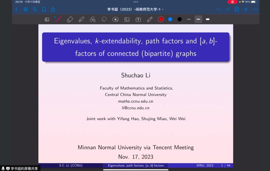 邀请,11月17日上午,华中师范大学李书超教授在腾讯会议作了题为《图因子存在性的谱刻画及其相关问题研究》的报告。相关师生聆听了此次报告,报告由卢福良老师主持。