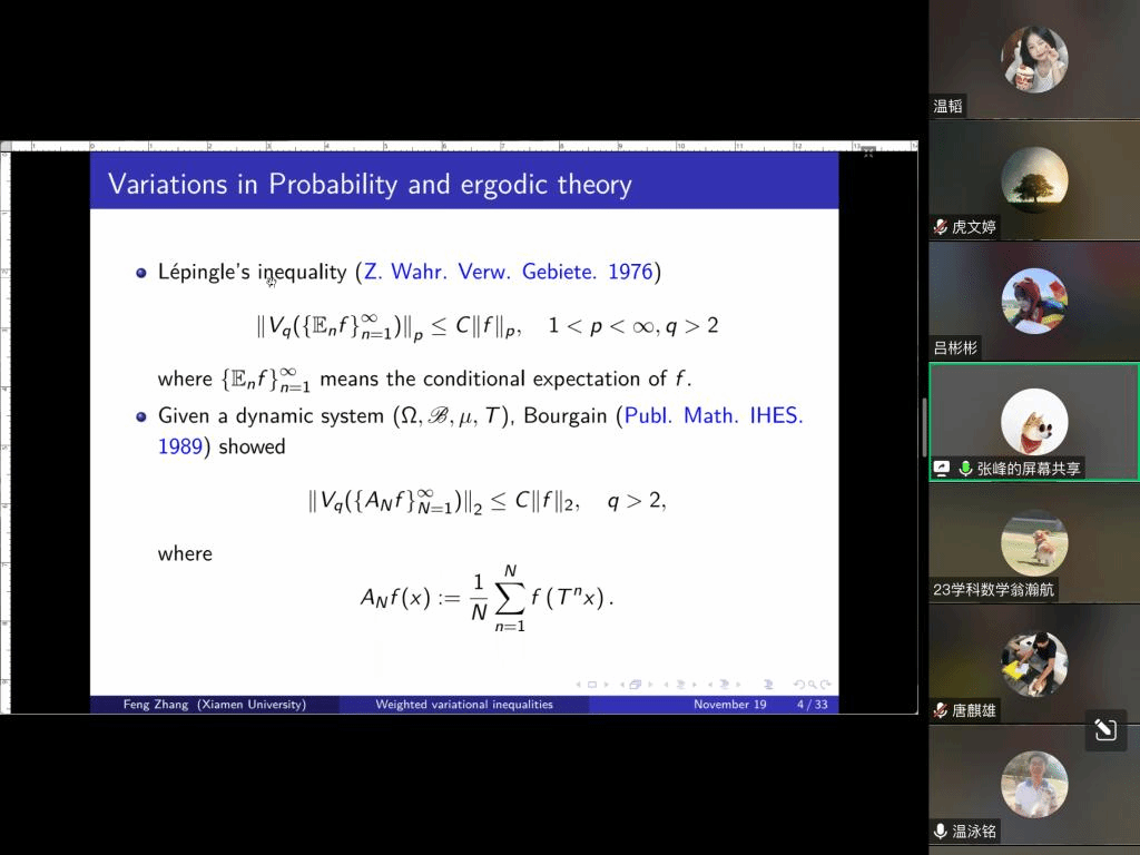 邀请,11月19日晚上,厦门大学张峰博士在腾讯会议作了题为《RD空间上奇异积分的变差不等式》的报告。相关师生聆听了此次报告,报告由温泳铭老师主持。