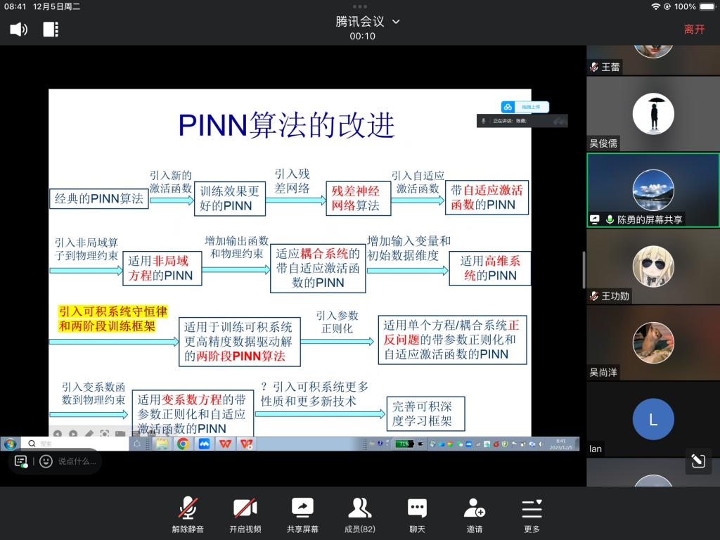报告中,陈勇教授主要介绍了机器学习-可积深度学习算法的主题。提出了基于迁移学习的梯度增强型PINNs(TL-gPINNs)方法,用于函数系数发现的反问题,以克服神经网络中PDE损失离散特性的不足,并提高函数特征描述的准确性,为gPINNs提供了新的视角。TL-gPINN算法被应用于推断各种形式(多项式、三角函数、双曲函数和分数多项式)和多个变量系数的未知变量系数,同时提供了丰富的孤子解用于著名的变系数非线性Schrödinger方程。与PINN和gPINN相比,TL-gPINN在准确性方面取得了显著改善。此外,这些方法利用了迁移学习技术的优势,可以帮助缓解由于额外梯度损失项而导致的效率问题。数值结果充分证明了TL-gPINN方法在显著提高准确性方面的有效性,即使在训练数据受到不同水平噪声干扰或神经网络的超参数任意更改的情况下,在效率上胜过了gPINN。报告结束后,在座的师生就相关研究问题进行了探讨和交流。