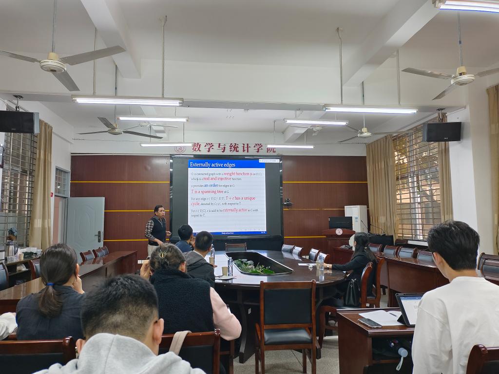 报告中,董峰明教授主要介绍了分层树的最新结果。具有m层的分层图G=(V,E)是一个简单图,其中V⊆[n](:={1,2,...,n})并具有从V到[m]的满射映射t,称为G的分层映射,使得只要v>v'且vv'∈E,t(v)>t(v')就成立。对于n的任何有序分区p=(p1,p2,..,pm),令Tp表示具有顶点集nI和分层映射t:[n]→[m]的分层树T的集合,使得|t-1(i)|=pi,对于所有i∈[m]。设Pp(q)=∑T∈TPqw(T),其中w(T)是T.Dugan、Glennon、Gunnells和Steingrlmsson的权重[J.Combin.Theory,Ser.A164 (2019),24-49]要求提供恒等式Pp(q)=Pπ(p)(q)对于1,2,...,m的任何排列π的基本证明,其中π(p)=(pπ(1),pπ(2),...,pπ(m))。在本文中,我们将通过应用Tutte多项式来证明此恒等式的扩展。这是与浙江师范大学严慧芳教授的合作成果。报告结束后,在座的师生就相关研究问题进行了探讨和交流。