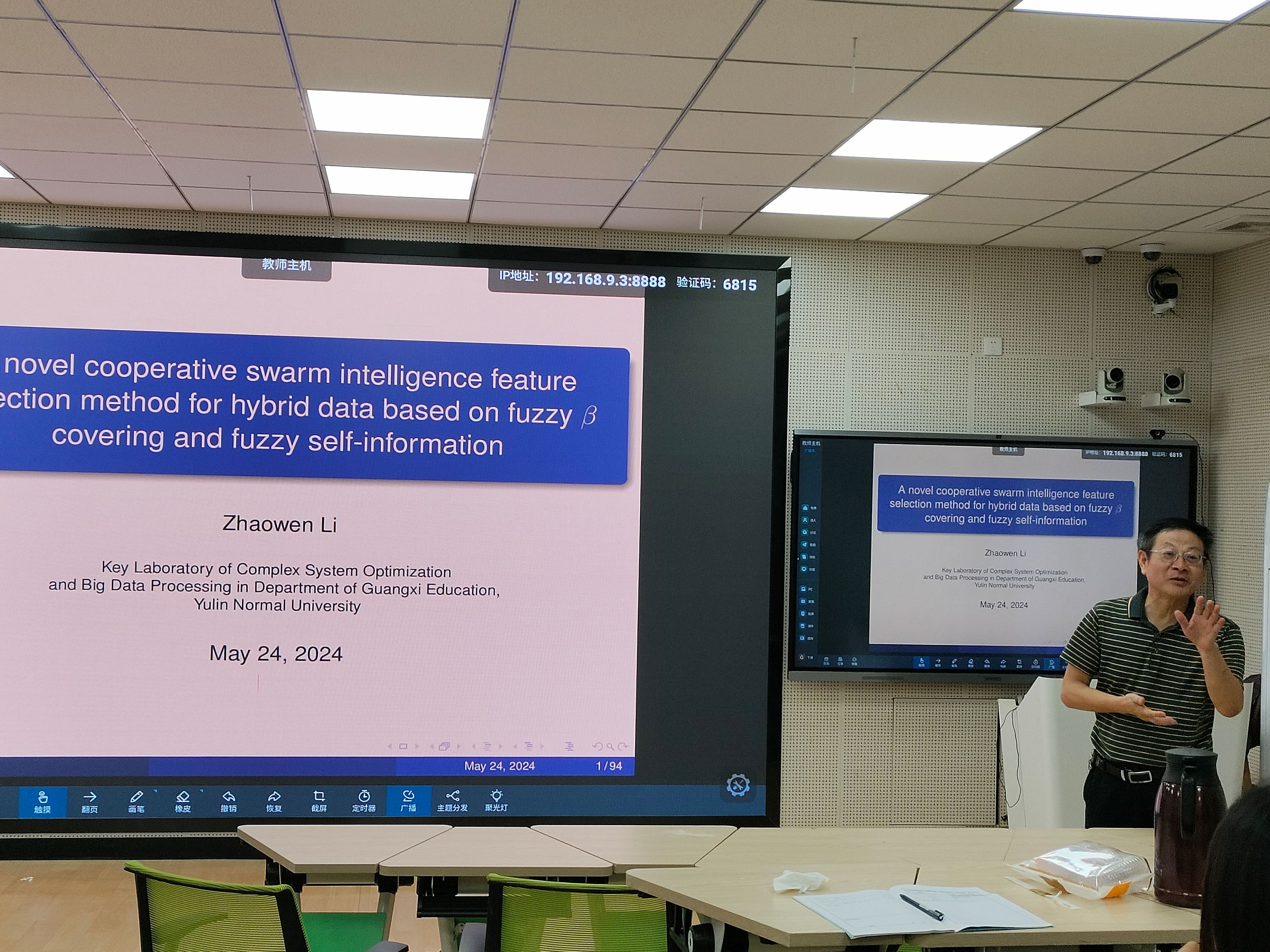 邀请,5月24日上午,玉林师范大学李招文教授在砺志楼114作了题为《一种基于模糊β覆盖和模糊自信息的混杂数据的协同群智能特征选择方法》的报告。相关师生聆听了此次报告,报告由林国平老师主持。