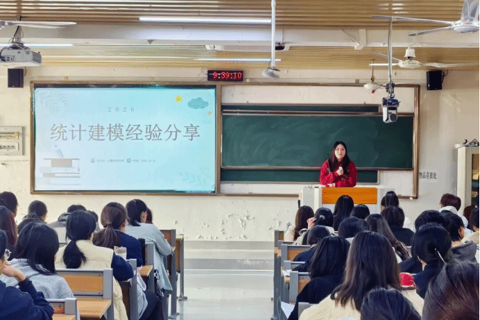 统计建模竞赛获奖者分享会上,2025年(第十一届)全国大学生统计建模竞赛省级一等奖获得者周梦婷与省级三等奖获得者张露文受邀主讲。周梦婷聚焦赛前筹备核心,从参赛队伍互补搭配、选题方向的现实价值与数据可得性研判,到统计模型的适配选择,为同学们梳理了备赛前期的关键逻辑。张露文则将重点放在赛中输出环节,深入讲解数据处理的核心技巧,同时结合自身经验分享统计报告的逻辑架构设计与规范表述要点,助力同学们打造逻辑严谨、内容扎实的参赛论文。