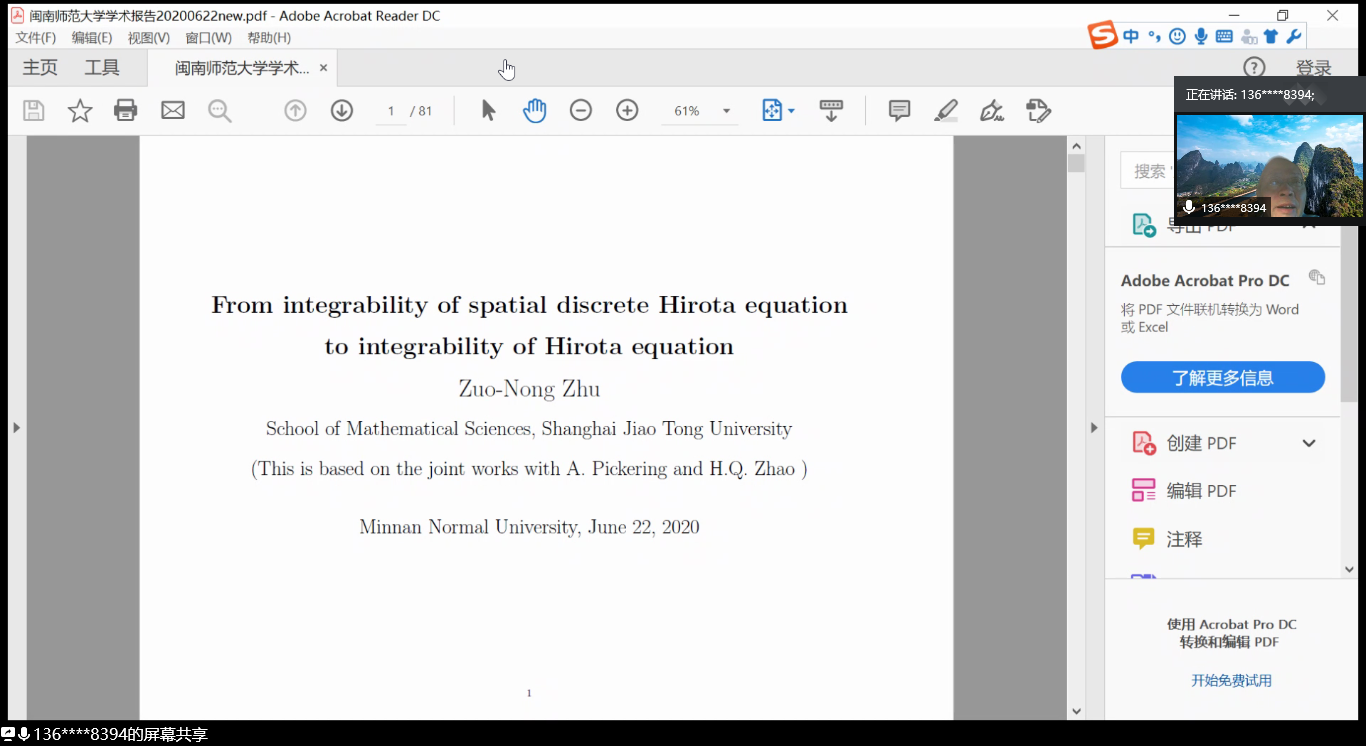 邀请,6月22日上午,上海交通大学朱佐农教授在腾讯会议作了题为《From integrability of spatial discrete Hirota equation to integrability of Hirota equation》的报告。相关师生聆听了此次报告,报告由吴晓峰教授主持。