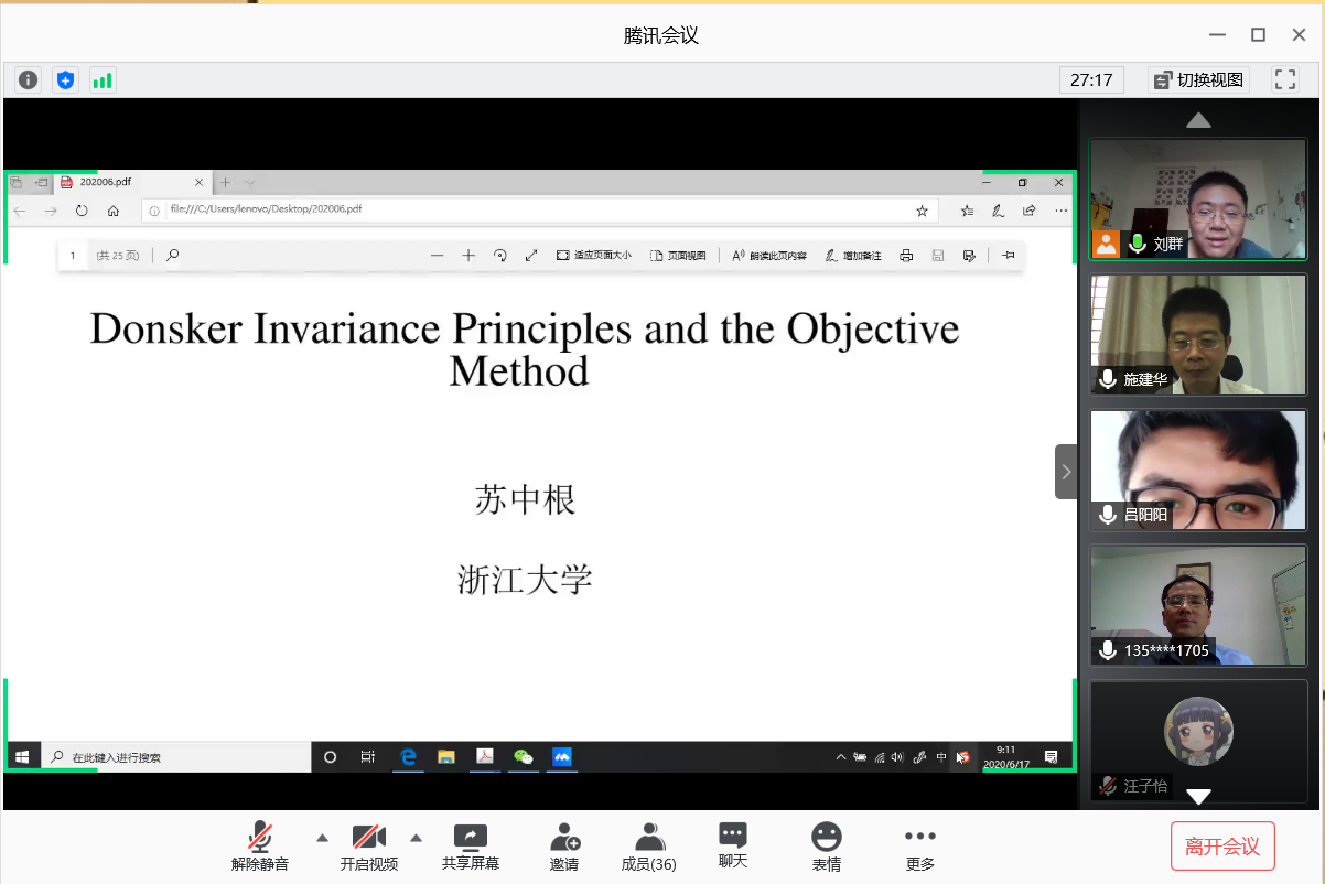 邀请,6月17日上午,浙江大学苏中根教授在腾讯会议作了《On the Donsker Invariance Principles and the Objective Methods》的报告。相关师生聆听了此次报告,报告由刘群副教授主持。