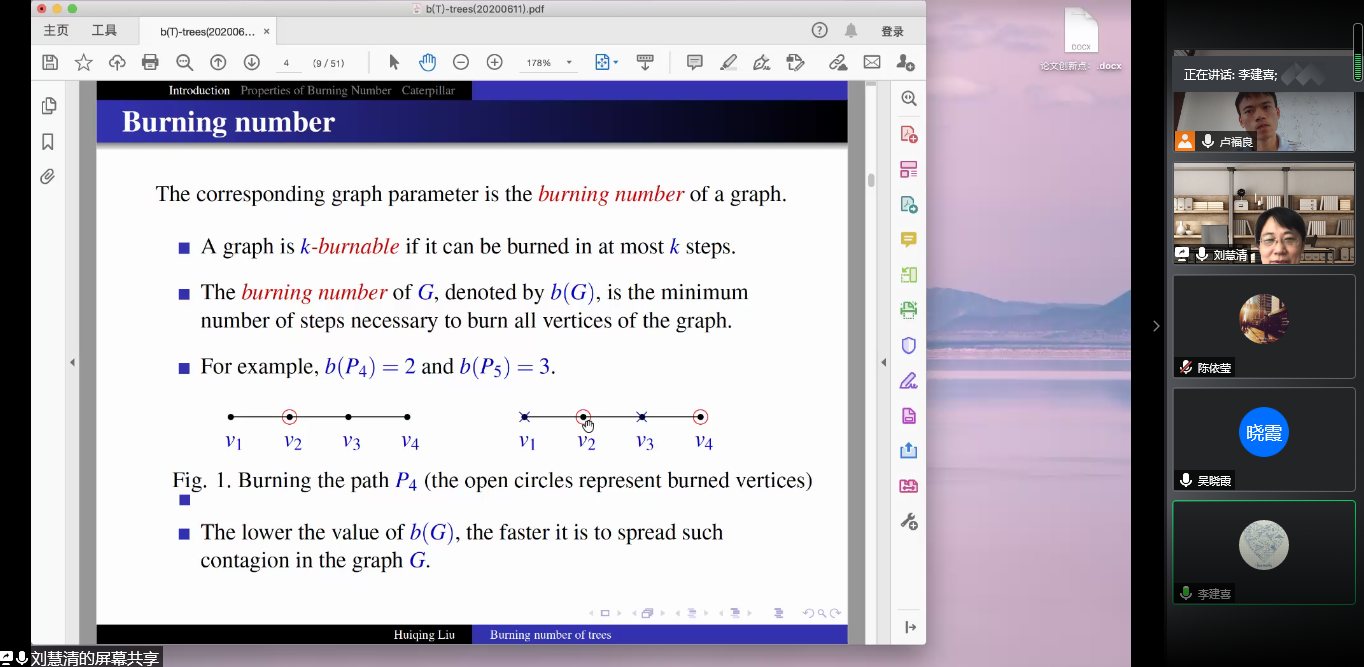 邀请,6月11日上午,湖北大学刘慧清教授在腾讯会议作了题为《On the burning number of trees》的报告。相关师生聆听了此次报告,报告由卢福良教授主持。