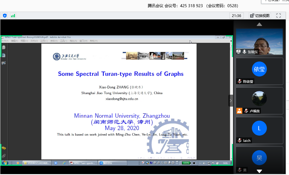 邀请,5月28日上午,上海交通大学张晓东教授在腾讯会议作了题为《Some spectral Turan-Type results of graphs》的报告。相关师生聆听了此次报告,报告由卢福良教授主持。