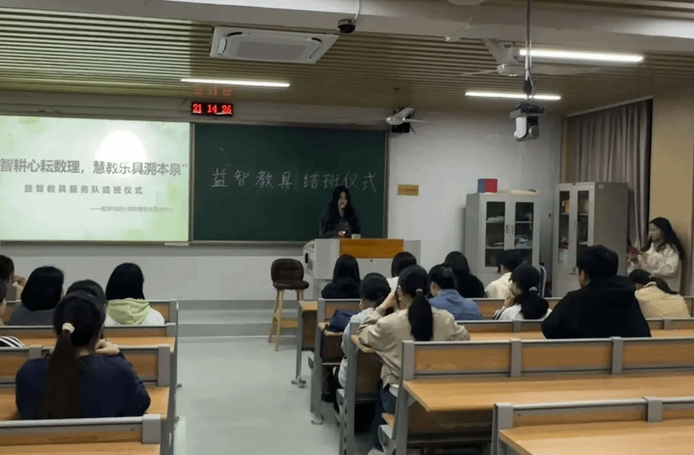 服务队成员代表依次进行发言,其中第四小组周梦婷同学表示:益智教具活动提高了我们空间想象能力,同时提升了我们的数学素养。