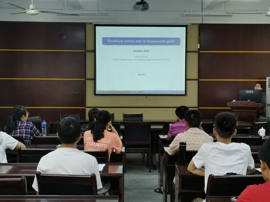 邀请,10月18日的上午,青海师范大学任海珍教授在砺志楼114作了题为《Feedback vertex sets in honeycomb grids》的报告。相关师生聆听了此次报告,报告由李建喜副院长主持。