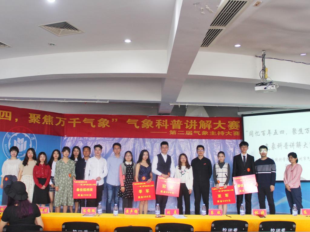 团委联合主办,学院艺术团、青年志愿者中心承办的“同忆百年五四,聚焦万千气象”——气象科普讲解大赛暨第二届气象主持人大赛在达理活动中心三楼报告厅圆满落幕。漳州市气象局高级工程师黄声锦、陈锦鹏,气象局科普创新团队负责人刘美,校团委副书记蔡斌老师,学院党委副书记林晓老师、团委书记陈明老师及辅导员出席本次活动。