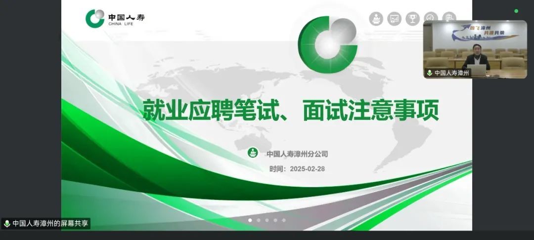 召开“解锁银行保险岗,共赴职业新航道”线上主题沙龙活动,为正处在求职关键期的2025届毕业生送去“及时雨”。此次活动邀请中国人寿漳州分公司人力资源部经理、中国人寿漳州分公司党委组织部部长柯培辉作为主讲嘉宾,为即将步入职场的毕业生传授宝贵的求职笔试、面试技巧,助力他们提升就业竞争力,在求职道路上精准发力。会议由研究生辅导员李伟俊老师主持,21级辅导员李巍婷老师和2025届毕业生参加本次活动。