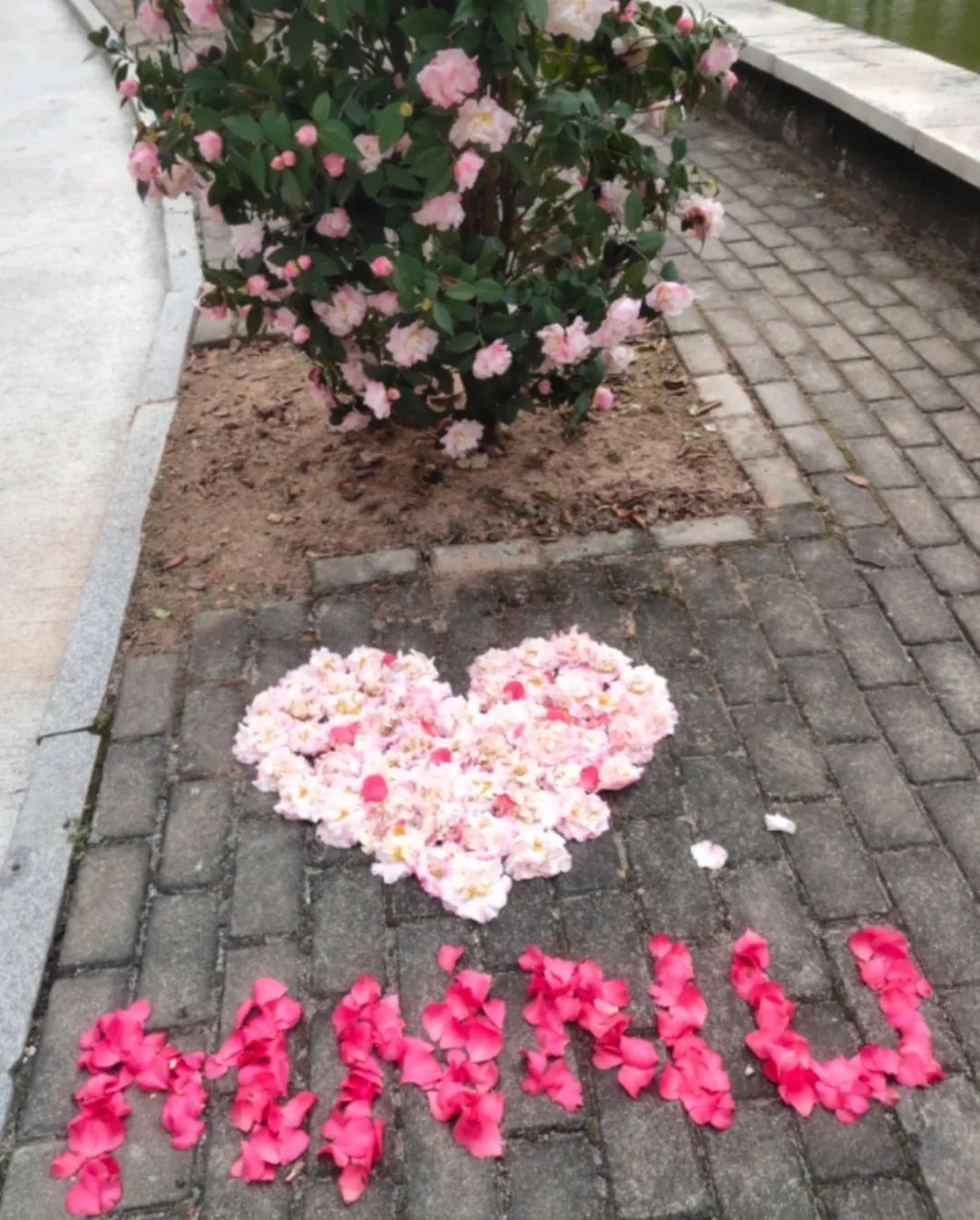 在我们学校图书馆附近的山茶花,它们散落在地上的花瓣被路过的同学摆成了一个心形,还摆了mnnu让人感觉特别温暖,也吸引了很多人去打卡。当然我也在其中,拍下了这一美丽的瞬间。