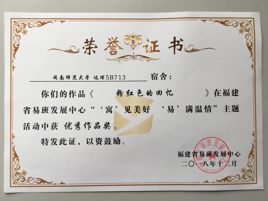 近日,福建省易班发展中心公布“‘寓’见美好,‘易’满温情”主题活动的结果,韩国av 2017级学生(达理5B713宿舍)的作品《粉红色的回忆》在该活动中荣获优秀作品奖。