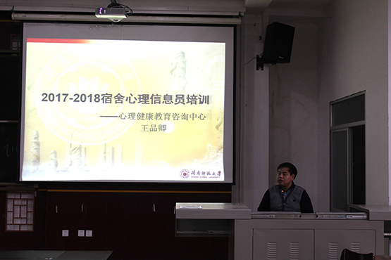 心理健康教育工作基础。宿舍心理信息员培训的内容包括宣传、普及心理健康知识,将心理健康教育渗透到宿舍中;适时参加学校或班级的心理健康活动,提高同学们的心理健康水平;及时发现宿舍有心理危机的学生,有效协助班委、心理辅导员做好危机干预工作。他还结合实际的案例,深入浅出地说明心理信息员的责任之大和影响之深。