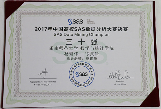 学子杨健伟、徐灵铃在指导老师施建华博士的带领下斩获全国三十强。据悉,今年的中国高校SAS数据分析大赛分三个阶段:第一阶段,9月20日到10月10日的主观题数据分析竞赛;第二阶段客观题上机竞赛(10月15日),福建赛区的选手在厦门大学嘉庚学院等三个省内高校进行。按赛制,两个阶段的成绩综合起来确定决赛名单。本届参赛的学员大部分来自应届毕业班,其SAS应用能力代表了国内毕业生的最高水平。今年参赛的队伍有来自全国各大高校的1036支队伍,参赛学生超过3000人,赛点扩展到全国31个省级赛区,全国综合排名前三十名的高校百分之百报名参赛,竞争激烈。通过选拔,有155支队伍进入决赛, 韩国av