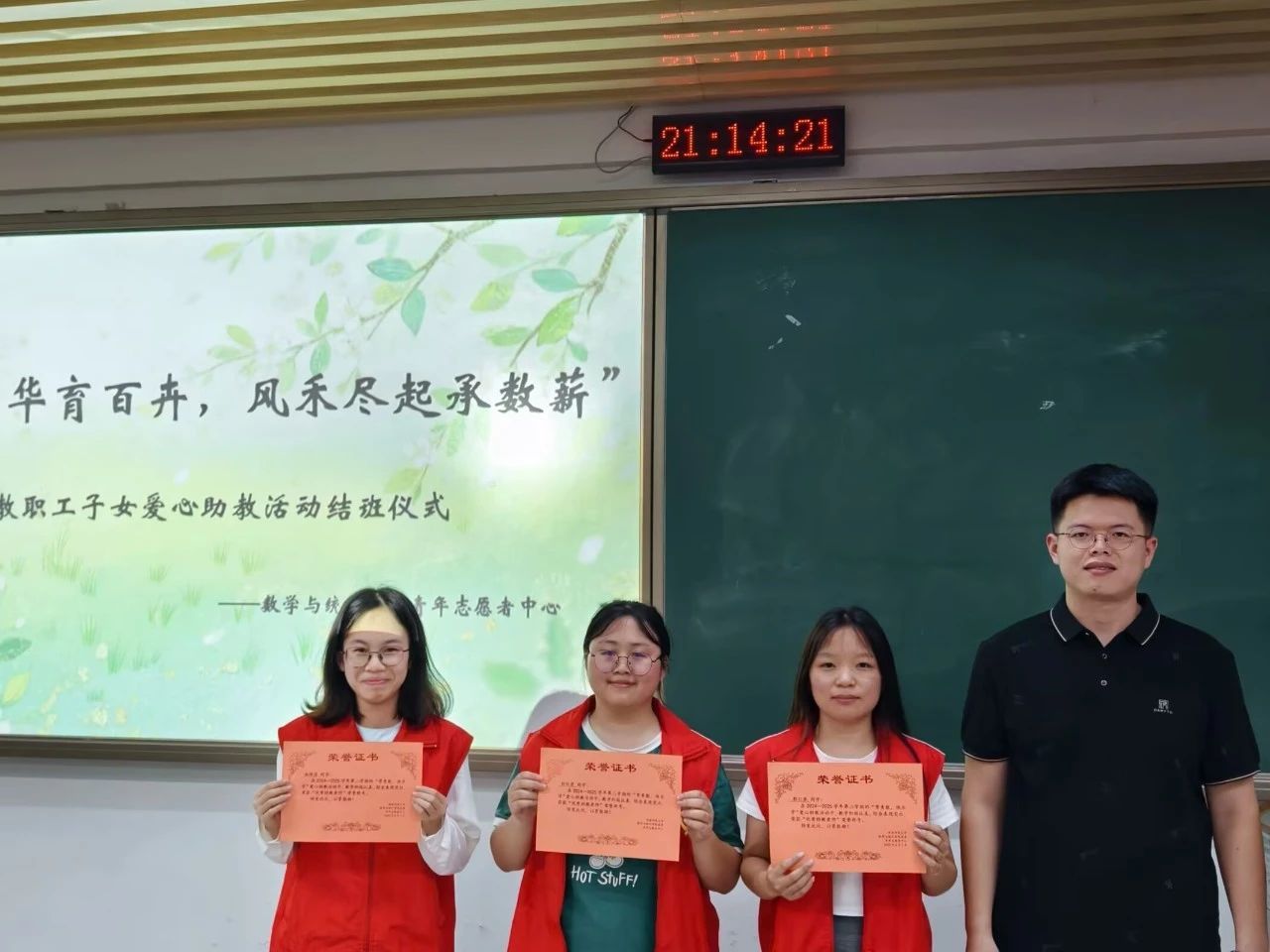 最后,朱旭泽老师为本学期的优秀助教老师颁发荣誉证书并合影留念。他们分别是:22数据郭引弟、23数一林焯佳、23数五刘红君。