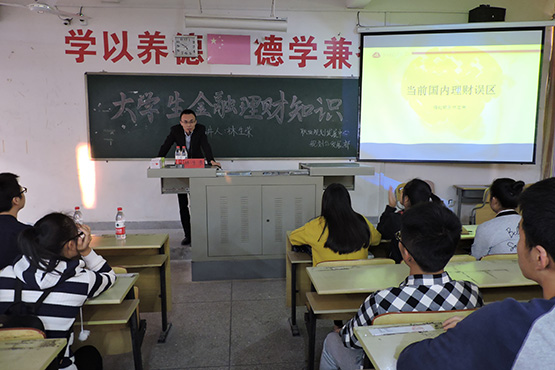 学生开展大学生金融知识讲座。林总经理通过分析2015年大学生信用认知调查报告结果为听众对相关金融知识做简单介绍。并对“校园贷”问题围绕其在校内流行的原因、校园贷的催款方式以及如何维护自身合法权利等角度讲解校园贷相关知识。在此基础上,逐一介绍P2P,虚拟货币,现贷原油、外汇,股票推荐、全国性交易所,借助相关实例,深入浅出地讲解日常生活中的理财误区,以此警戒大家注意自己的个人信息安全,鼓励学生树立正确的理财观念。