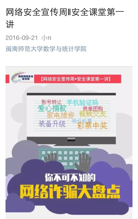 微信公众号平台上推送“安全课堂”,通过对常见网络诈骗的盘点,如虚假票务诈骗、网络兼职诈骗、虚假中奖诈骗等,以图文并茂的方式,更大范围地营造安全上网、依法上网的良好校园氛围,提升广大师生财产及信息的安全意识,让“网络安全为人民,网络安全靠人民”的理念深入人心。