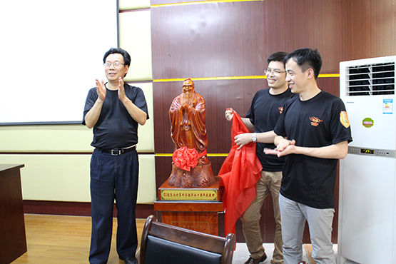 座谈会的最后,为表达对母校的感恩之情,该班同学还特别定做了一尊孔丘像赠送给学院,由李进金校长和02信息班班长、团支书共同揭幕,祝数统学院教育事业蒸蒸日上。