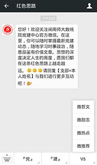经过认真筹划精心准备,积极推出党员微信公众学习平台“红色思路”,该平台开设了党风廉政、党员风采、党史今日、微热点、微哲文、微励志等特色栏目,每周定期推送相关内容,倡导党员进行有价值的阅读和提升,致力于打造一个能提高党员内在党性修养的思想政治教育平台,也为党组织和党员间提供一个互动交流的及时有效平台。通过这一学习平台的运作,确实解决教师党员理论学习不深入和学生党员入党后续教育不足理论学习不够的难题。