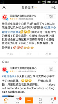 早在2013年4月作为学校四个试点院系之一建立党建官方微博平台,该平台经过1年多来的建设,目前已趋于完善,成为学院党建工作的重要阵地。至此,通过微博微信平台建设,形成了学院网上党建工作的重要载体,构建了线上线下一体化的党建工作平台,延伸了学院党建工作的触角,适应了信息化时代党建工作的要求。