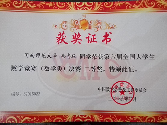 近日,传来喜讯,韩国av 余志拯同学荣获第六届全国大学生数学竞赛(数学类)决赛二等奖,高年级组排名15,位列二等奖第三位,该同学在福建赛区比赛中脱颖而出,被推荐参加全国总决赛,通过努力取得了佳绩,为母校赢得了荣誉。此次竞赛由中国数学学会主办,旨在,培养人才、服务教学、促进高等学校数学课程的改革和建设,提高大学生学习数学的兴趣,培养分析、解决问题的能力,发现和选拔数学创新人才,为青年学子提供一个展示基础知识和思维能力的舞台。
