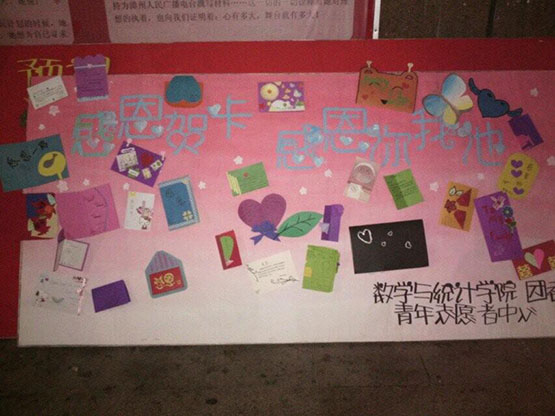 贺卡感恩活动由志愿者亲手制作卡片,分成两类,一类进行派送,一类进行展览。派送类贺卡在感恩节当天晚上由志愿者们派送到各个宿舍,将寄卡人的祝福与感谢送至被感谢人手中。展览类的贺卡经过精心筛选,经同学们同意后,粘贴于板块在行明隧道展示。这些贺卡都表达了同学们对身边的亲人、朋友、老师、同学甚至是陌生人的感恩之情。