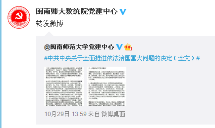 学生党建中心积极策划,通过“线上、线下”两条渠道多种载体广泛组织学生党员及入党积极分子开展学习讨论活动,营造了良好的理论学习氛围。通过“数统学院学生党建中心”微博平台及时转载《中共中央关于全面推进依法治国重大问题的决定》,借助网络平台开展了激烈的微博互动讨论。11月2日,学院分党校借助培训的有利时机,及时组织第七期全体学员以小组为单位广泛开展学习党的十八届四中全会精神活动,各组通过PPT展示、报告、、辩论、心得体会交流等形式深入学习了十八届四中全会精神,加深了对依法治国的进一步理解。同时,还组织下班党员、下宿舍党员以班级和宿舍党章理论学习小组为阵地,带领学生掀起学习党的十八届四中全会精神的热潮,引导学生紧跟时事,把自己的人生梦与构建中国特色社会主义法治社会紧密结合起来。
