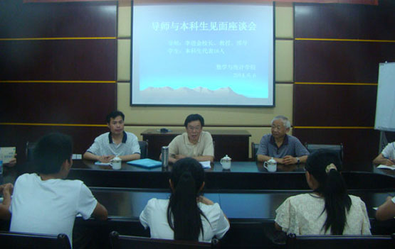 座谈会在轻松愉快的氛围中开始,李校长首先一一认识了指导的16名本科生,亲切地问起学生“家住哪里”、”小学中学数学老师是谁”、“为什么选择数学”等贴近学生的话题,拉近与学生的心理距离,循循善诱激起了学生对数学专业浓浓的兴趣。接着他与指导学生近距离分享了他如何从培养学习数学的兴趣开始,逐步确立人生志向并为目标持之以恒不断进取的人生发展历程,正所谓“追求数学,成长自己”。他鼓励学生若想在数学领域有所建树,一定要及早确立目标,培养对数学的浓厚兴趣,并做好坚持不懈奋斗的思想准备。座谈中,他不时就“数学与人生”话题与学生们开展互动交流。最后他还主动告知学生自己的联系方式,表示将通过不定期约见谈心、开展专题讨论等方式为学生的成长成才导航。