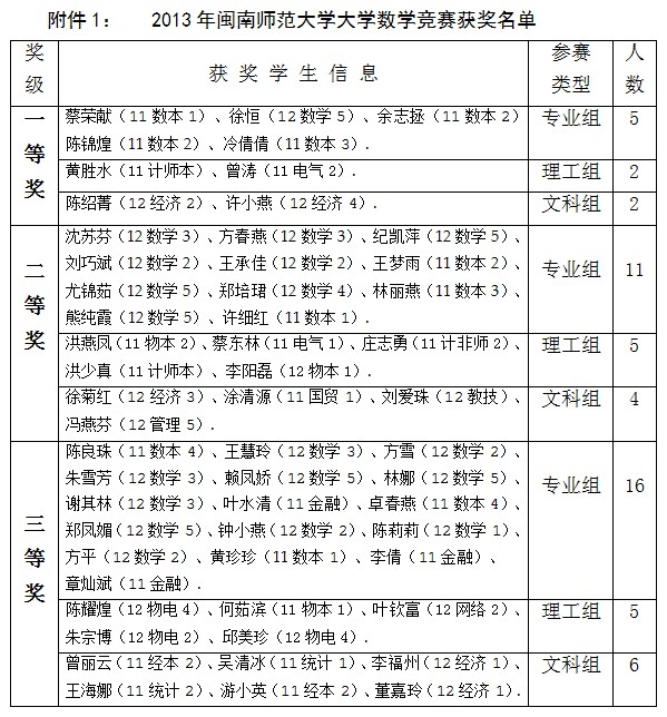 2013年韩国av 大学数学竞赛于2013年11月30日上午举行,经竞赛组委会组织专业教师评卷、专家组评审,对拟获奖的名单公示,最终确定本次竞赛一等奖获得者9名,二等奖获得者20名,三等奖获得者27名。另有6人分别获得2013年第五届全国大学生数学竞赛福建赛区竞赛二、三等奖。(获奖名单详见附件1、2)