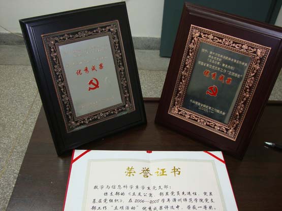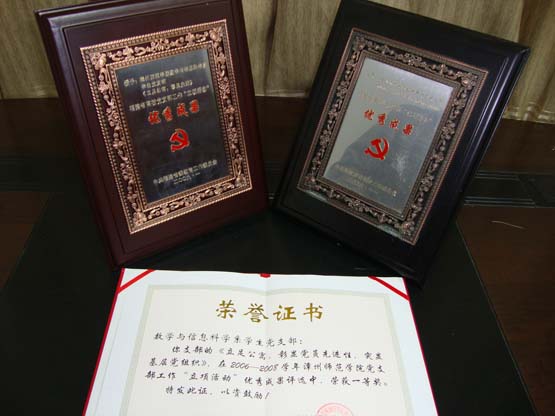根据省委教育工委关于高校党支部工作“立项活动”的部署和要求,数学系结合本系学生的具体情况,于2006—2008学年积极组织开展以《立足公寓,彰显党员先进性,突显基层党组织》的学生党支部立项活动。此项活动取得了良好成效,不仅增强了本系学生党员的凝聚力、创造力和战斗力,而且更好地服务同学,真正做到了党员“为人民服务”的宗旨。在2009年1月福建省高校党支部工作“立项活动”评选中,该项目被中共福建省委教育工作委员会授予优秀成果奖。此次获奖是继2004年11月数学系学生党支部《两地高校学生党员携手社会实践,一次党员教育形式和组织模式的创新》在福建省高校党支部“立项活动”获得优秀成果奖后再次获此殊荣,并于2009年3月被中共漳州师范学院委员会组织部评为 韩国av
