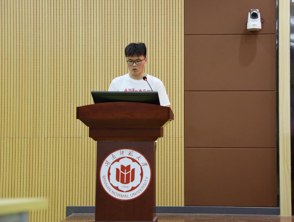 第六届全国师范院校师范生教学技能大赛一等奖获得者陈辉煜同学在分享获奖感言中,对校领导的关心支持、学校提供的良好设施、指导老师的悉心教导,竞赛队友的互帮互助表示衷心的感谢,并分享了竞赛过程中的心路历程。他表示,在庆祝中国共产党建党100周年之际,希望与各位同学一起,不忘初心、牢记使命,用不懈的努力、顽强的拼搏,去达到希望的高峰。