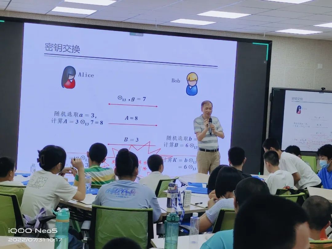 黄振杰老师主讲“如何公开协商密钥”。首先,黄老师介绍了保密通信的广泛应用及其实现方式。其次,黄教授以定义模13运算为例,让学员们理解密钥交换。第三,黄振杰教授用两个小游戏详细讲解了密钥交换的过程。最后,黄老师用“水平面是平的吗?”、“存在3个直角的三角形吗?”、“两条平行线会相交吗?”这3个问题带领学员在欧式几何和非欧式几何中去感悟如何快乐学数学。