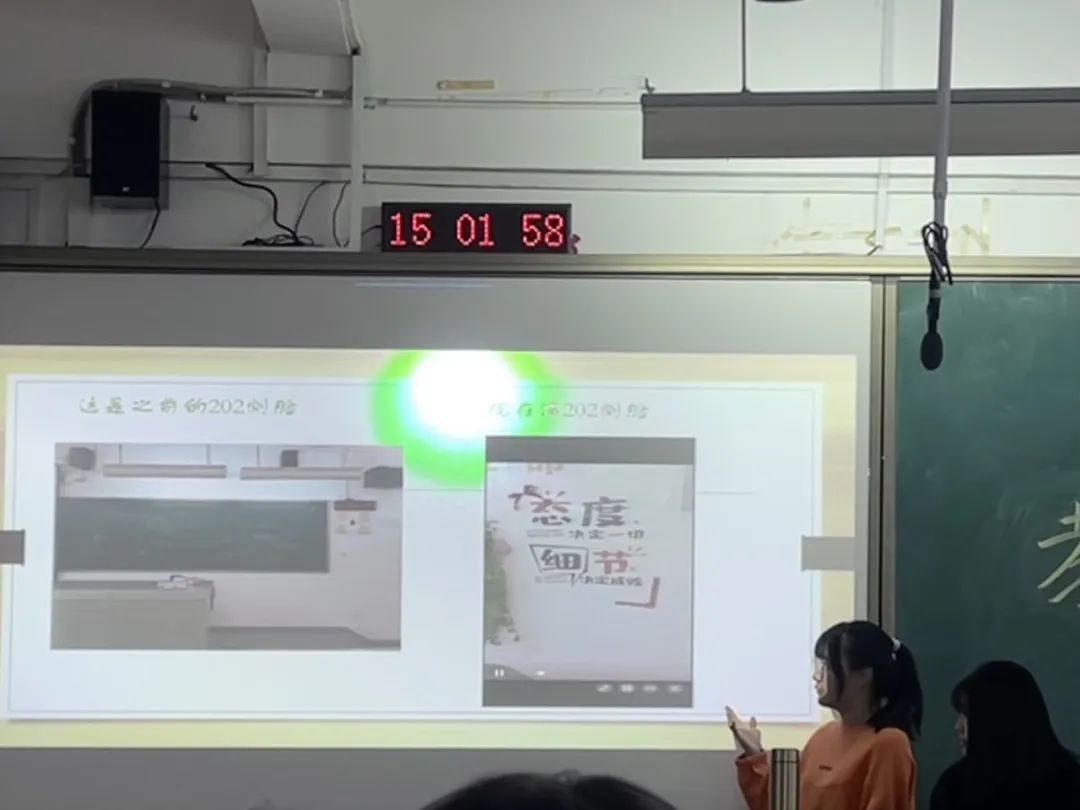 本次比赛的参赛班级通过制作ppt和播放视频的形式展示教室装扮成果,各班级的讲解员根据视频和ppt为现场评委观众讲述装扮理念和装扮细节。