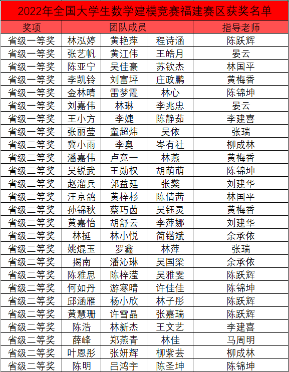 获得2022年高教社杯全国大学生数学建模竞赛福建省赛区一等奖8项,福建省赛区二等奖18项