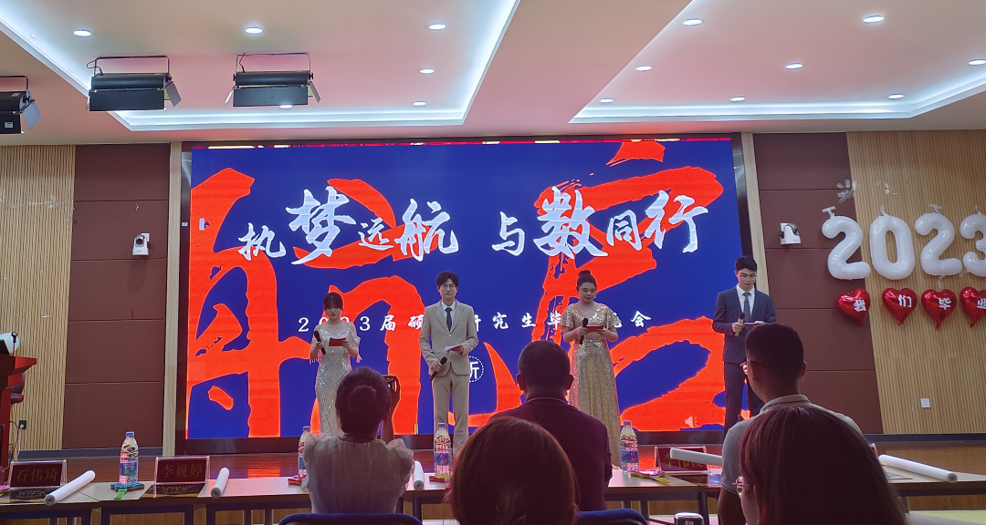 “执梦远航,与数同行”2023届硕士研究生毕业晚会在砺志楼120成功举行。学院党委副书记胡海智老师、研究生辅导员郑珊老师、19级辅导员李伟俊老师以及学院100余名同学齐聚晚会现场,共享温馨时刻。