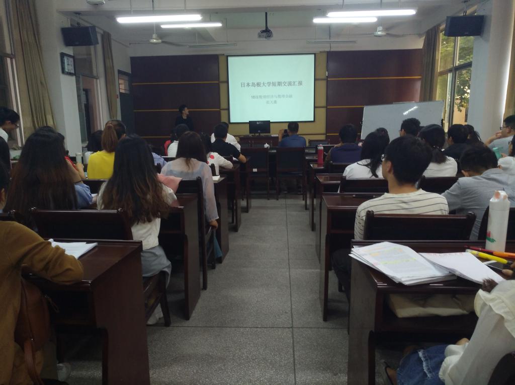 2016级研究生张天衢、李嘉达在砺志楼114分享日本岛根大学为期半年的访学交流体会。林福财教授、郭宝霖教授以及全体研究生出席了会议,会议由研究生会宣传部长彭圆红主持。